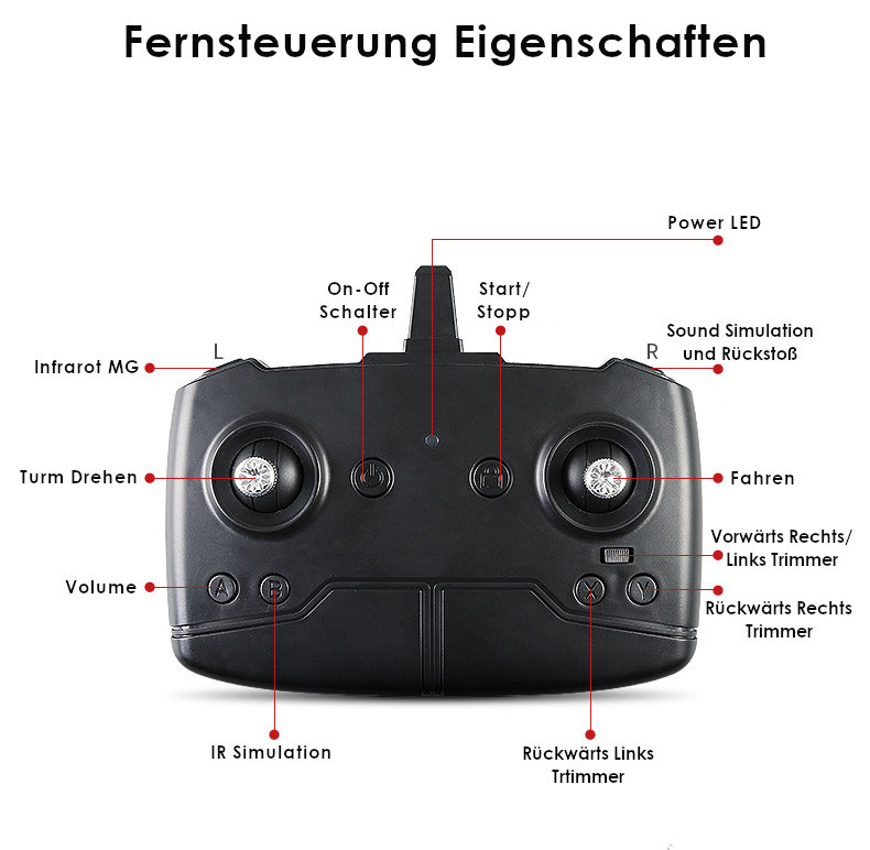• Rückstoßfunktion. (Beim Schießen streckt sich die Kanone aus und fährt wieder zurück. Und der Panzer bewegt ich sich dabei ruckartig nach hinten (Rückstoß)