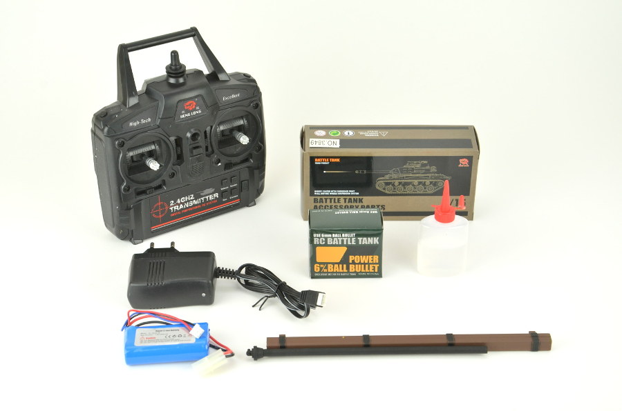 Fernbedienung: Vorwärts / Rückwärts normal und HIGH SPEED, Vorwärts Links oder Rechtsdrehung, Rückwärts Links oder Rechtsdrehung , Kanone heben und senken, Geschützturm um 320° drehbar (160° rechts / 160° links), Munitionsabschuss auch während der Fahrt